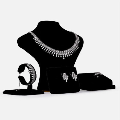 طقم اسوره وخاتم نسائي فاخر باللون الفضي يتميز بتصميمه الأنيق والمبهر الذي يضفي لمسة من الفخامة على كل إطلالة يتكون الطقم من سلسال، حلق، خاتم، واسوارة، مع تفاصيل مرصعة بفصوص وأحجار الزركون اللامع مما يضمن لكِ إطلالة ساحرة في المناسبات الخاصة.